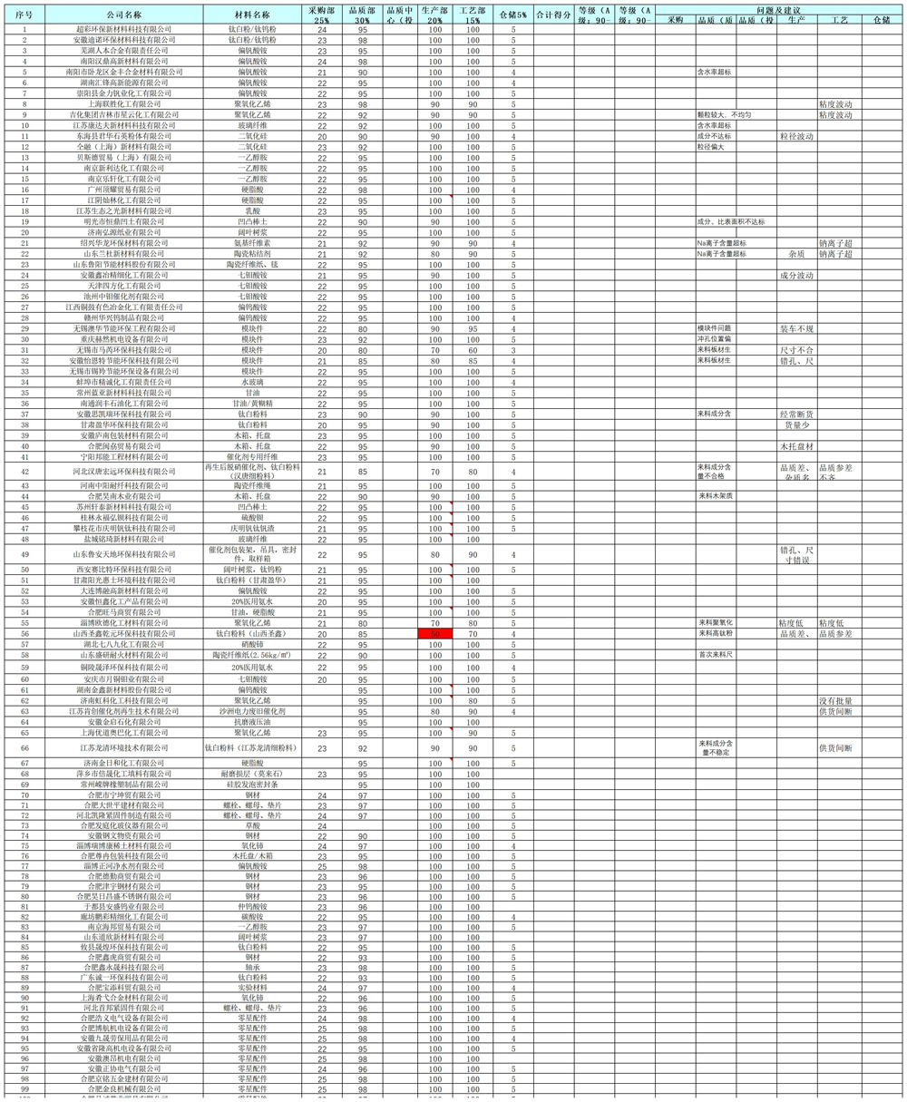 元琛環(huán)??萍棘F(xiàn)有供應(yīng)商206家,按其影響程度劃分為高、中、低風(fēng)險(xiǎn)供應(yīng)商,其中低風(fēng)險(xiǎn)比為98%。為了更好的對供應(yīng)商進(jìn)行管理,制定有《供應(yīng)商管理辦法》、《供應(yīng)商績效評估表》、《供應(yīng)商準(zhǔn)入申批》,按照文件要求制定供應(yīng)商審計(jì)計(jì)劃并按時(shí)進(jìn)行審計(jì),高中風(fēng)險(xiǎn)供應(yīng)商審計(jì)率為100%。能夠確保我司供應(yīng)商管理要求,降低物料質(zhì)量風(fēng)險(xiǎn),保證采購的物料符合質(zhì)量標(biāo)準(zhǔn)要求。