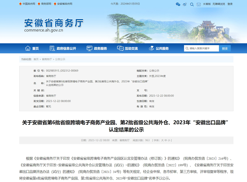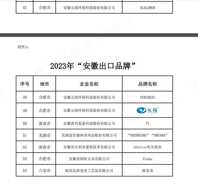 近日,安徽省商務廳公布2023年“安徽出口品牌”認定名單, 此次評選全省共44家企業,54個品牌獲得認定,元琛科技“