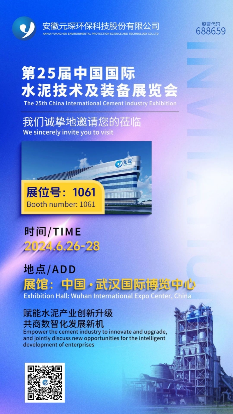 From June 26 to 28, 2024, Anhui Yuanchen Environmental Protection Technology Co., Ltd. will be invited to participate in the 25th China International Cement Industry Exhibition, booth No. 1061, looking forward to your visit ~