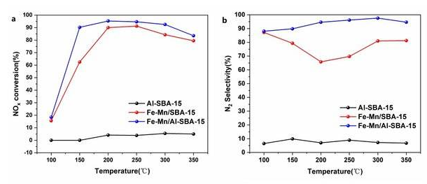 圖2. Fe-Mn/SBA-15催化劑和Fe-Mn/Al-SBA-15催化劑的NH3-SCR脫硝活性結果. a NOx轉化率.b N2選擇性