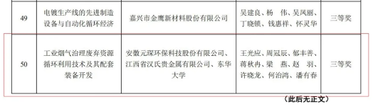 安徽元琛環(huán)保科技股份有限公司“工業(yè)煙氣治理廢棄資源循環(huán)利用技術及其配套裝備開發(fā)”項目獲得三等獎。